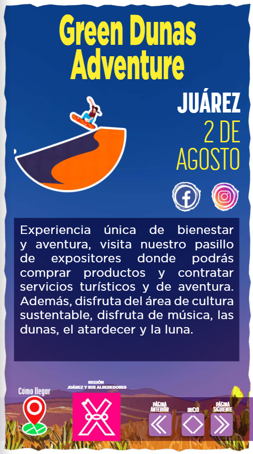 Experiencia única de bienestar y aventura, visita nuestro pasillo de expositores donde podrás comprar productos y contratar servicios turísticos y de aventura. Además, disfruta del área de cultura sustentable, disfruta de música, las dunas, el atardecer y la luna.