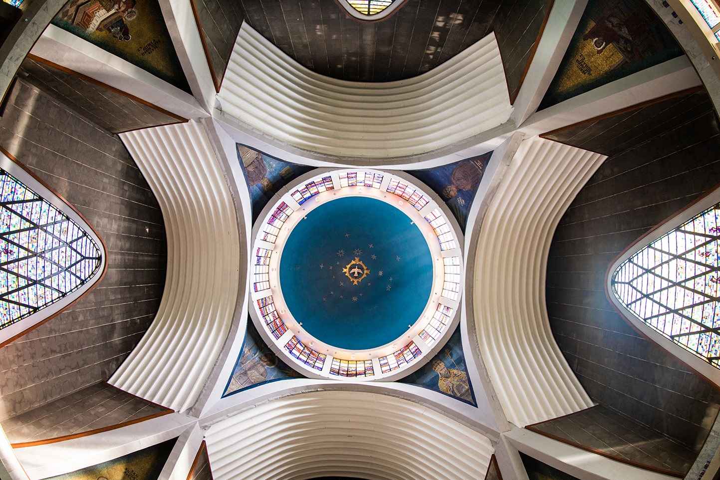 The first stone was laid in 1952 and construction lasted until 1960. The four 33 meter parabolic arches were built between 1956 and 1957. Prior to this work, most of the construction had focused on the pilings and foundations. With the arches complete, the vaults and the dome could begin. The total area of the dome is 630 square meters. This was finished in 1958 and a first mass was said in 1959 once the stained glass windows had been placed.