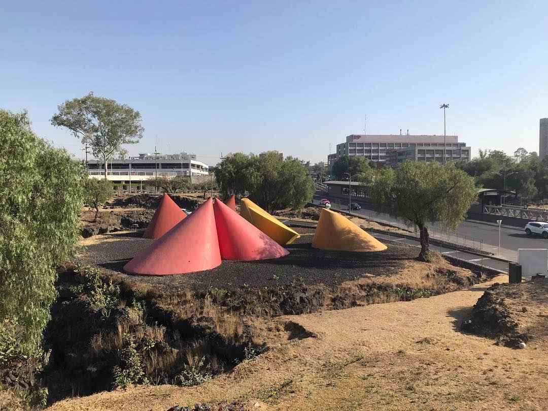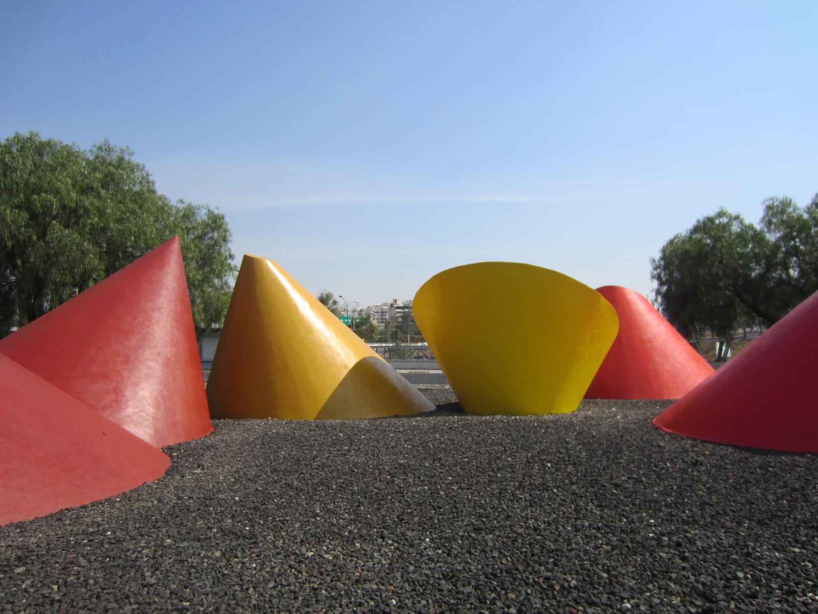 he Friendship Route arranged giant public sculptures along the roads leading to the main Olympic Village of the 1968 Olympic Games. Grzegorz Kowalski's work is one of the most distinctive, but its relatively low profile means it's one of the most frequently missed.The giant work consists of seven cones cast in reinforced concrete, the tallest reaching some five meters in height. Today, the cones are painted in yellow, orange, red, and ochre, and each is arranged in within a broadly circular plot of land.