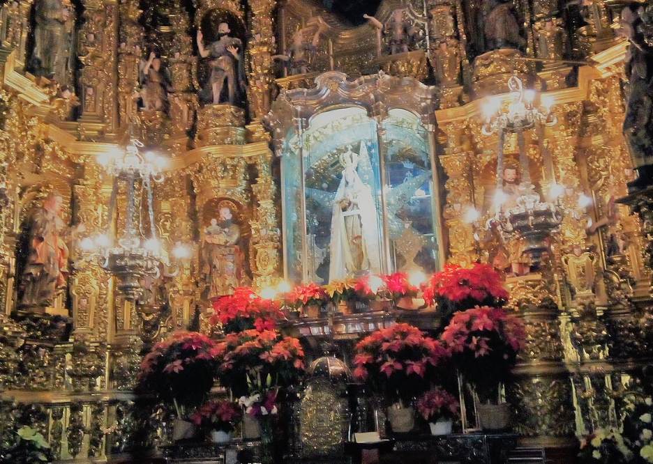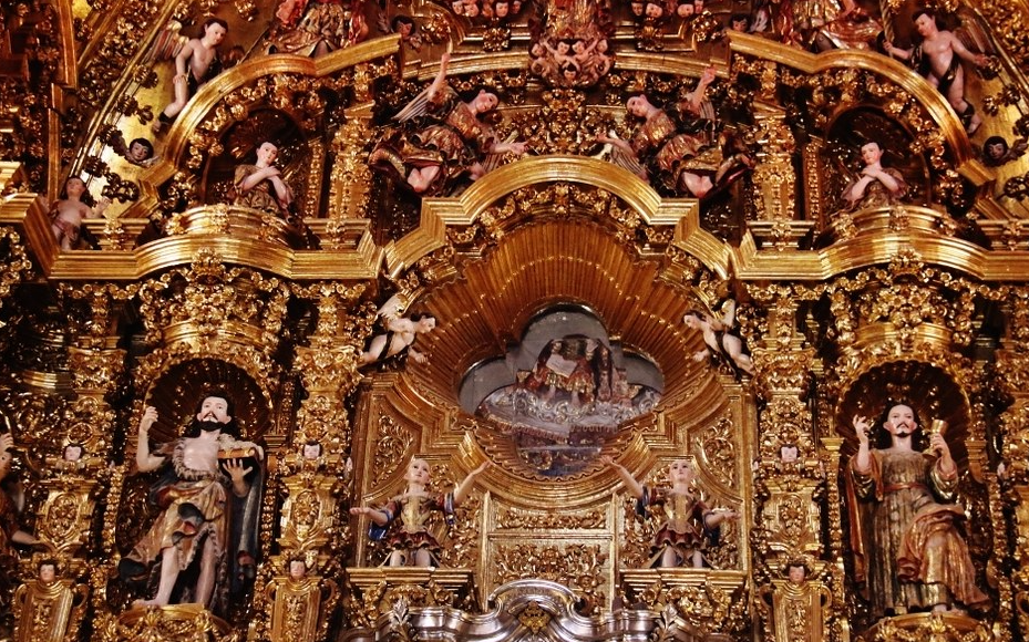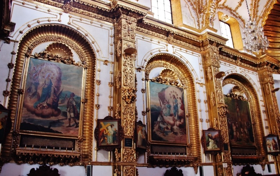 Later Franciscans visiting the area found a burning oak tree. Inside was another statue of the Virgin Mary. This was placed in the chapel and remains there to this day. The statue is almost an afterthought today within what is easily one of the most dramatically decorated interiors in the area.