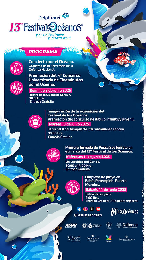 Se parte del 13° Festival de los Océanos, un evento único que une el arte, la ciencia y la cultura para promover la conservación marina. Iniciando el domingo 08 con una Orquesta Sinfónica "Esperanza Azteca" y la premiación del 4to concurso universitario de cineminutos por el océano, el martes 10 con la inauguración de la exposición del festival de los océanos y la premiación de dibujo infantil y juvenil, el miércoles 11 de junio se llevará a cabo la primera jornada de pesca sostenible y para finalizar con la limpieza de playa en Bahía Petempich, Puerto Morelos.