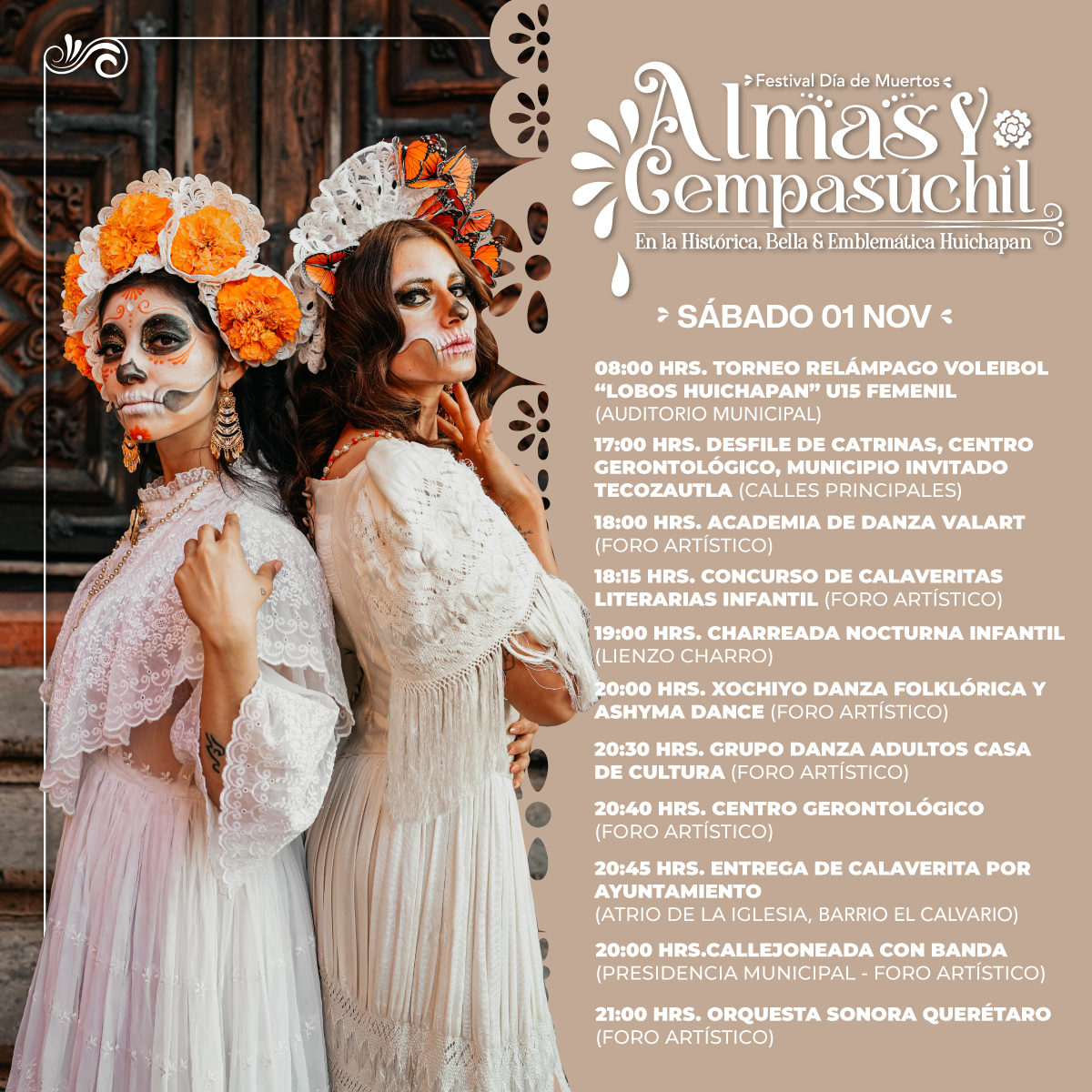 El festival Almas y Cempasúchil transforma el Barrio El Calvario y el panteón municipal de Huichapan en escenarios llenos de vida, luz y memoria. Déjate envolver por sus tradiciones con: