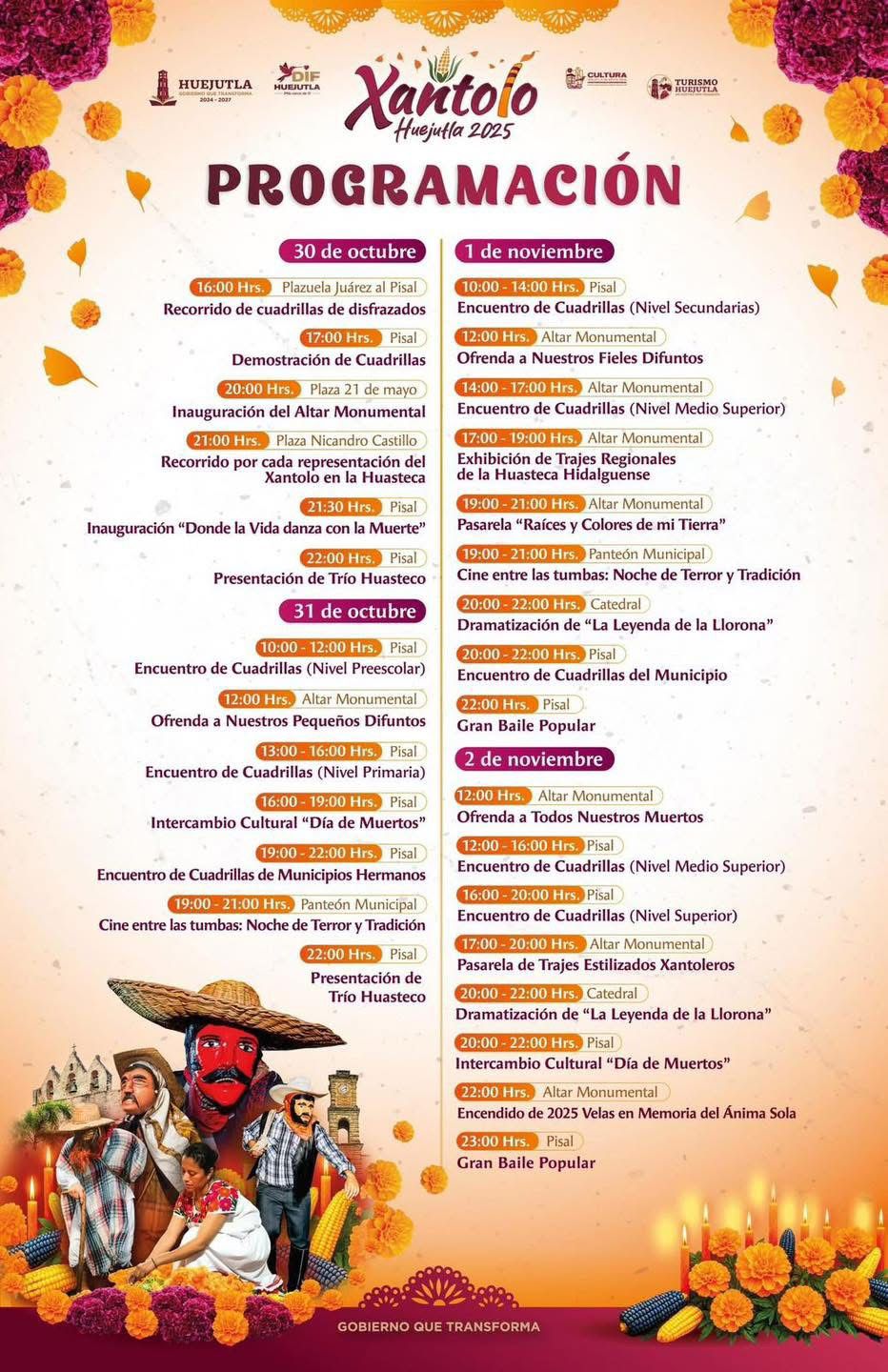 30 de octubre: Recorrido de cuadrillas de disfrazados, inauguración del Altar Monumental en la plaza 21 de mayo (20:00 h), apertura del pisal “Donde la vida danza con la muerte” (21:30 h) y presentación de un trío huasteco.