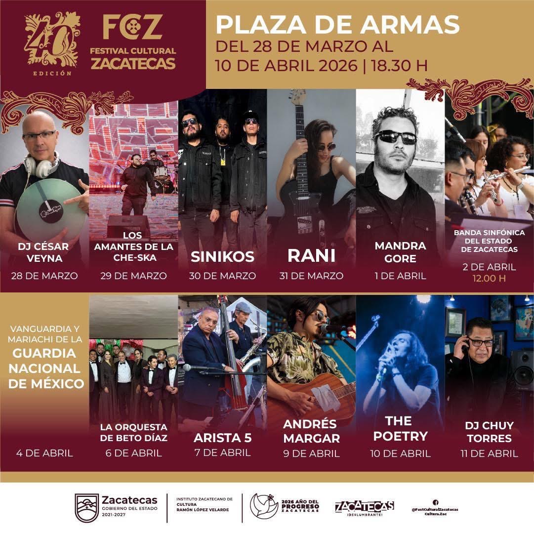 El Festival Cultural Zacatecas 2026 celebra 40 años de historia, arte y tradición del 28 de marzo al 11 de abril, con una programación extraordinaria que llenará de vida la capital zacatecana.