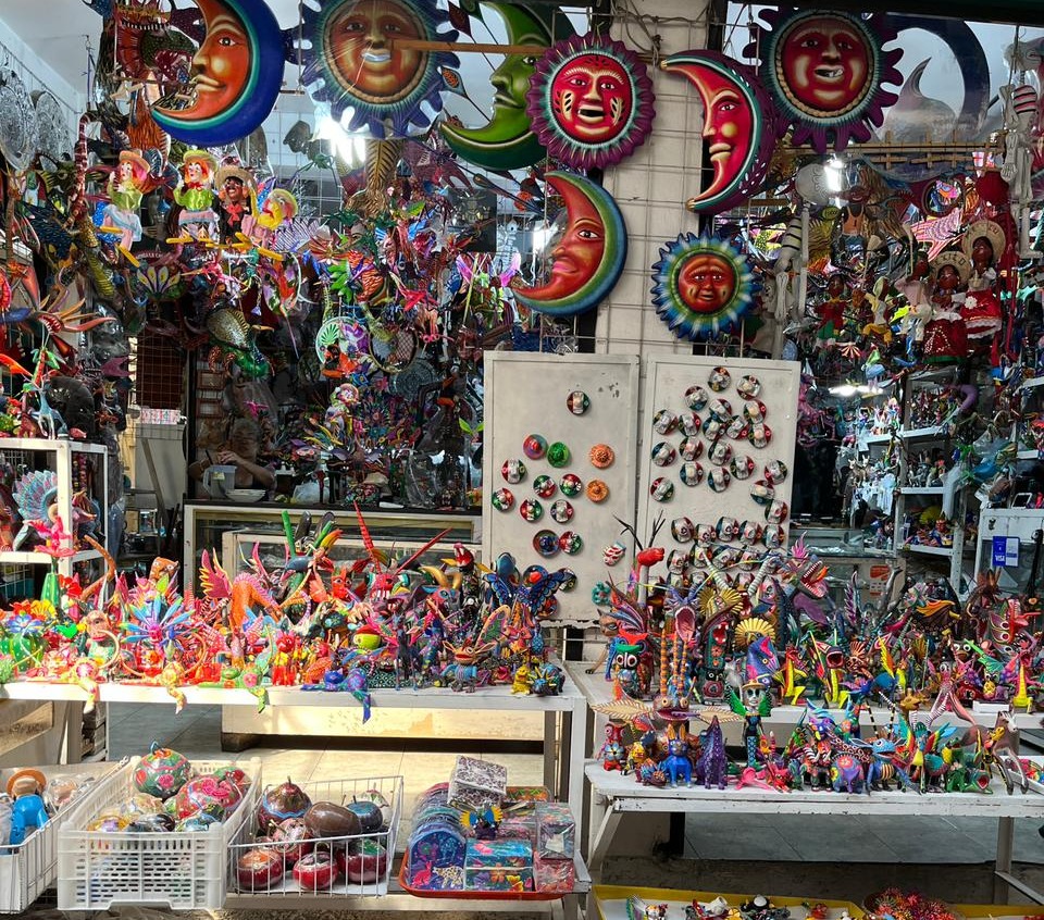 Esculturas: talladas en madera, piedra o cerámica, muchas provienen de los talleres artesanales de Guerrero y Oaxaca. Máscaras, figuras religiosas y pequeñas piezas decorativas llenan los estantes con historia y simbolismo.