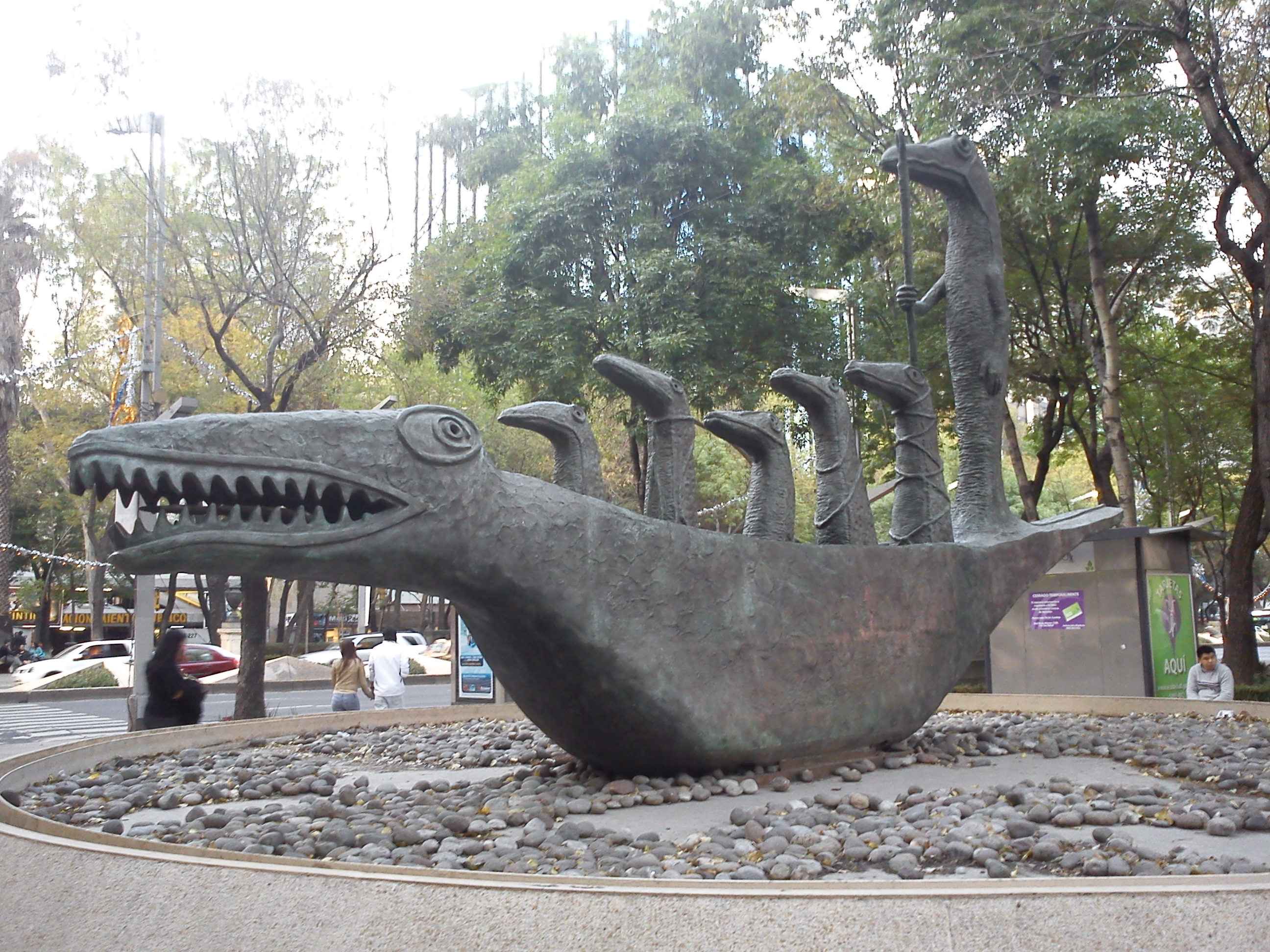 Cocodrillo, de Leonora Carrington, es una de las esculturas públicas más populares de Ciudad de México. Carrington donó la obra a la ciudad en 2000. A veces se le llama How Doth the Little Crocodile (español: Cómo hace el pequeño cocodrilo), tomando el título directamente del poema de Lewis Carrol del mismo nombre. Se dice que el verso de Carrol inspiró la escultura gigante de bronce y un cuadro del mismo año (1998). Se podría pensar que Carrington también se inspiró en el monumento de Tomás Chávez Morado a Alonso García Bravo, de 1976 . Esto no ha sido documentado, aunque el motivo del barquero de pie aparece en otros monumentos de la ciudad.El cocodrilo más alto, de unas cinco toneladas de peso y 8,5 metros de longitud, mide 4,5 metros. De hecho, es probablemente una de las esculturas públicas más fotografiadas de la ciudad.Originalmente, el Ayuntamiento colocó la escultura en una fuente abandonada de la Section 2 del Parque de Chapultepec . Pero en 2006, la propia artista eligió un emplazamiento preferente en el Paseo de la Reforma. El traslado fue acompañado con gran fanfarria.Carrington murió en 2011, una de las artistas más célebres del siglo XX de Ciudad de México. De origen británico, fue también pintora surrealista y novelista. Habiendo pasado la mayor parte de su vida adulta en la Ciudad, a menudo se la recuerda como una de las participantes más longevas del movimiento surrealista de la década de 1930. En la actualidad, la Universidad Autónoma Metropolitana (UAM) está trabajando para abrir su casa y estudio como centro cultural y museo.