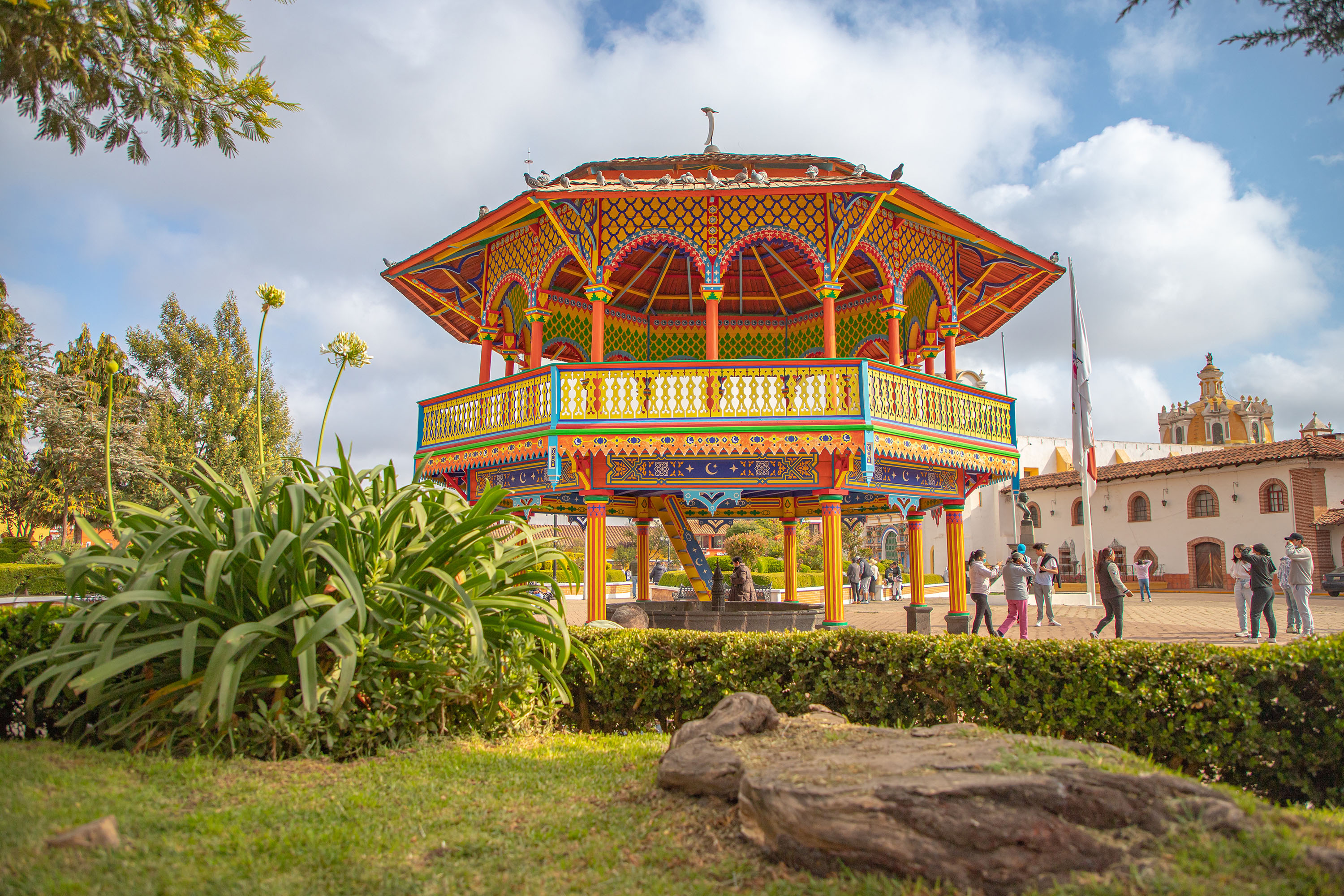 Chignahuapan, Pueblo Mágico de Puebla es conocido por su arquitectura colonial y sus hermosos paisajes montañosos, y el Quisco Mudéjar es uno de sus mayores atractivos. Este quiosco, situado en la plaza principal del pueblo, es una mezcla perfecta de estilos arquitectónicos mudéjar y colonial, con detalles finos en su estructura y una mirada nostálgica a los tiempos pasados. Es un lugar ideal para tomar fotografías y relajarse mientras se observa la vida cotidiana de este pintoresco pueblo.