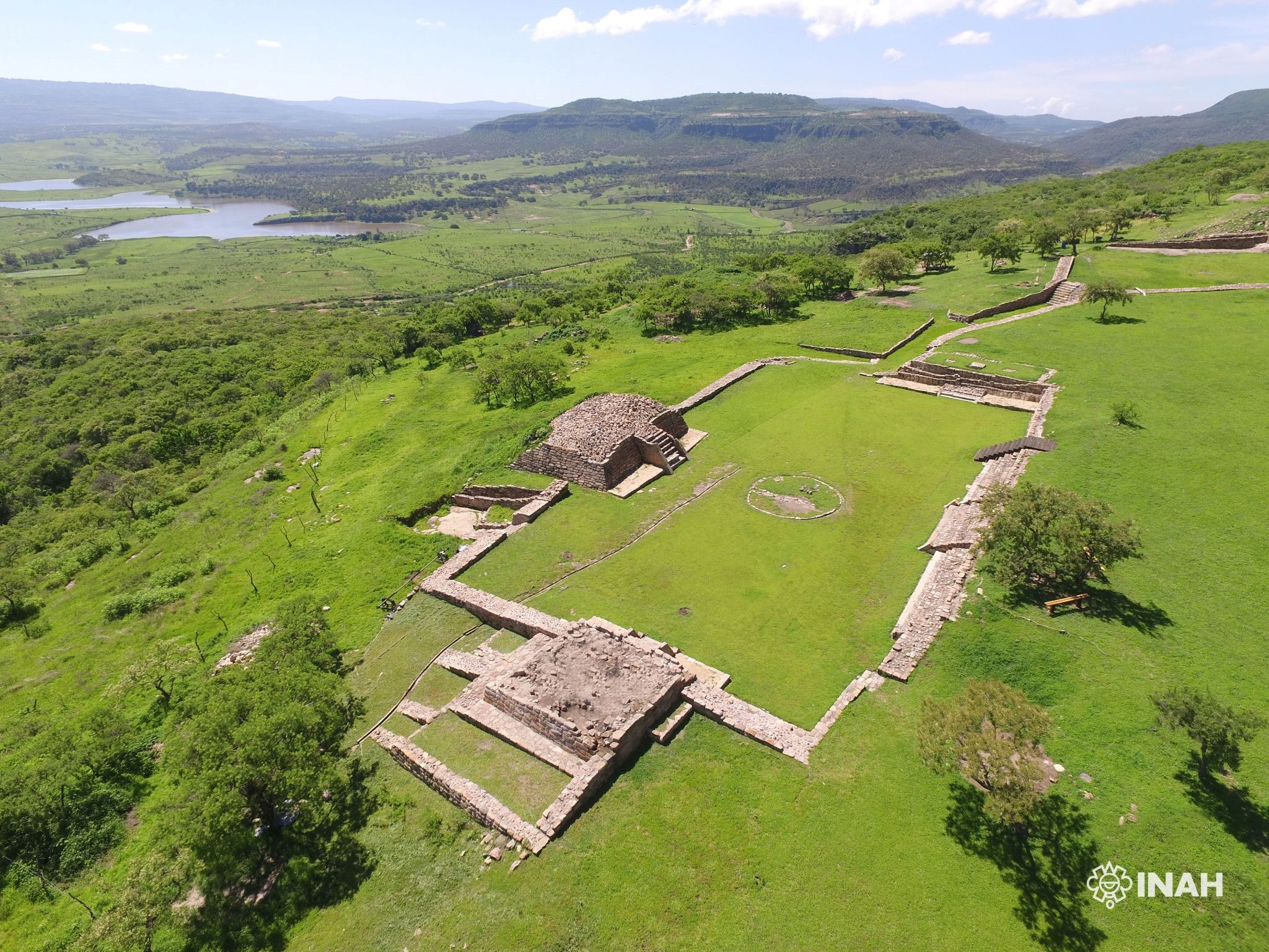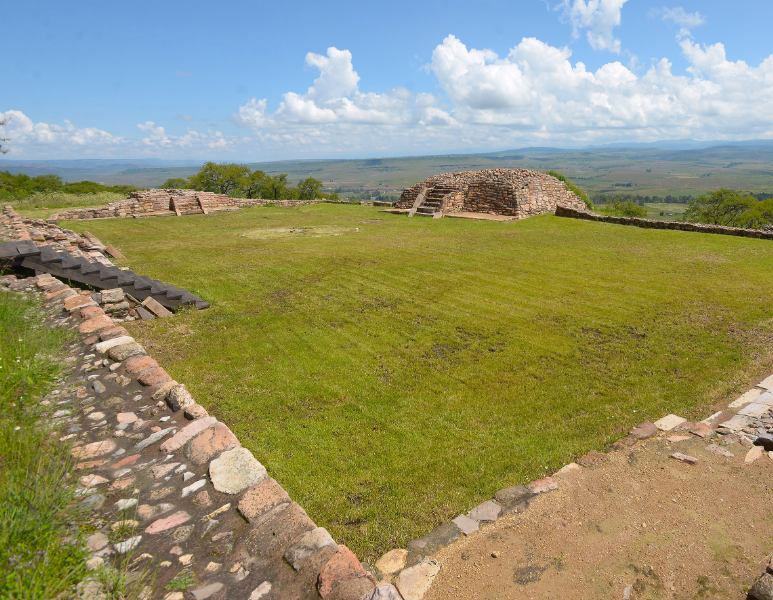 La plaza principal era el lugar donde se celebraban ceremonias religiosas relacionadas con la mitología cosmogónica. Dos bases piramidales comparten una escalera flanqueada por gradas. En la base de esta estructura discurre un canal que simbolizaba la serpiente acuática del inframundo. Derrotada por el sol, esta derrota dio lugar a opuestos complementarios como la noche y el día, arriba y abajo, y la sequía y la lluvia. Las pruebas encontradas en el yacimiento indican que la civilización de este lugar se benefició de redes comerciales de larga distancia. Alrededor del siglo VII d. C., se estableció el centro ceremonial en el extremo noreste de la colina. En pocos siglos, algunos edificios originalmente aislados se integraron en un circuito que conectaba los diferentes complejos arquitectónicos. El periodo de mayor esplendor de la ciudad se situó entre los siglos X y XIII d. C.