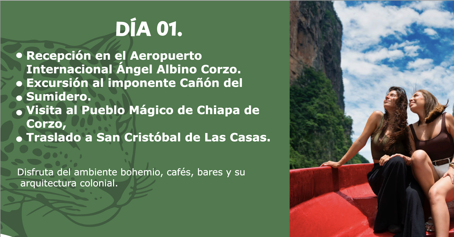 Llegada al Aeropuerto Internacional Ángel Albino Corzo. Excursión al imponente Cañón del Sumidero, una maravilla natural con paredes de más de mil metros de altura. Visita al Pueblo Mágico de Chiapa de Corzo, lleno de historia, color y artesanías. Traslado a San Cristóbal de Las Casas. Noche libre para disfrutar del ambiente bohemio, cafés, bares y su arquitectura colonial.