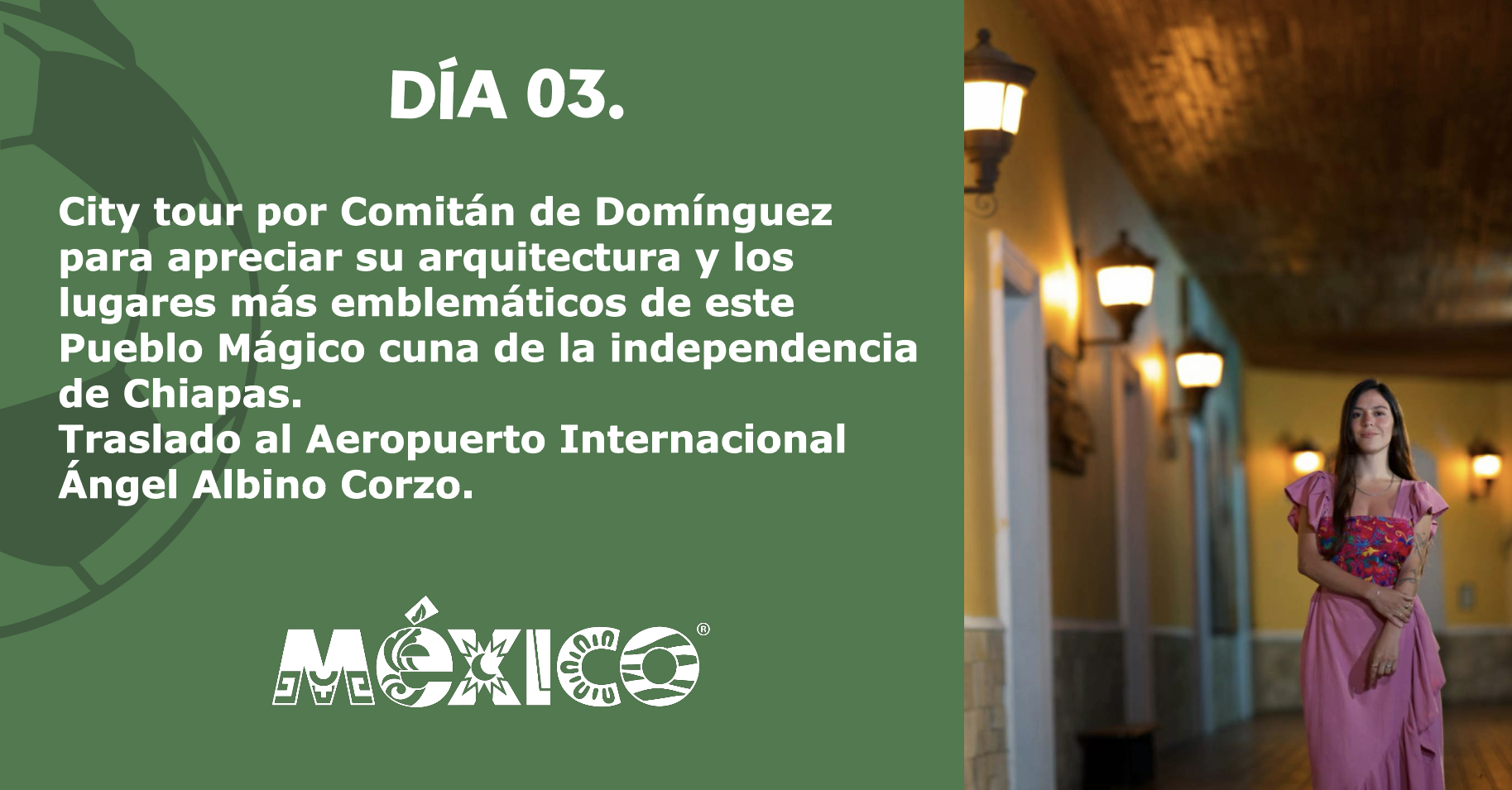 City tour por Comitán de Domínguez para apreciar su arquitectura y los lugares más emblemáticos de este Pueblo Mágico cuna de la independencia de Chiapas. Traslado al Aeropuerto Internacional Ángel Albino Corzo. Fin del recorrido.