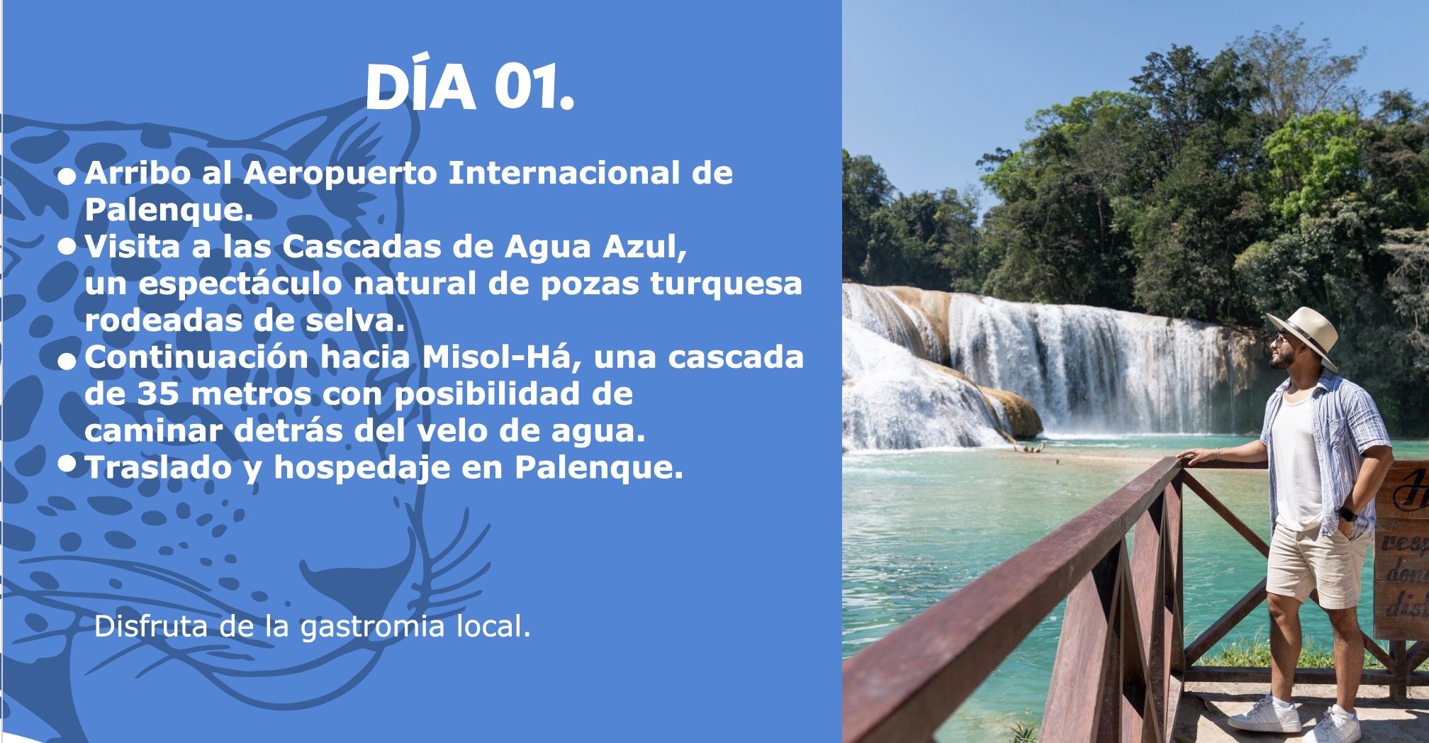 Recepción en el Aeropuerto Internacional de Palenque en el estado de Chiapas. Visita a las Cascadas de Agua Azul, un espectáculo natural de pozas turquesa rodeadas de selva. Continuación hacia Misol-Há, una cascada de 35 metros con posibilidad de caminar detrás del velo de agua. Traslado y hospedaje en Palenque. (Noche libre para disfrutar de la gastronomía local)