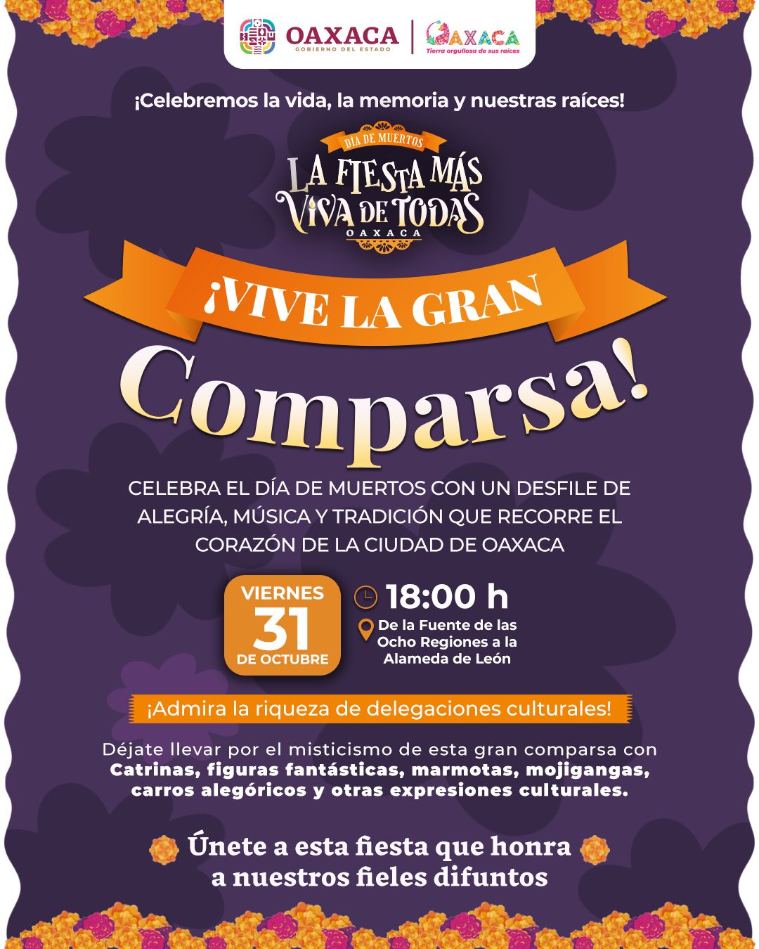 Acompáñanos este viernes 31 de octubre a las 18:00 horas, en un entorno lleno de color, música y tradición, que recorrerá el corazón de la ciudad: de la Fuente de las Ocho Regiones a la Alameda de León. Déjate envolver por la magia de las catrinas, figuras fantásticas, marmotas, mojigangas, carros alegóricos y muchas más expresiones que dan vida al espíritu festivo de Oaxaca.